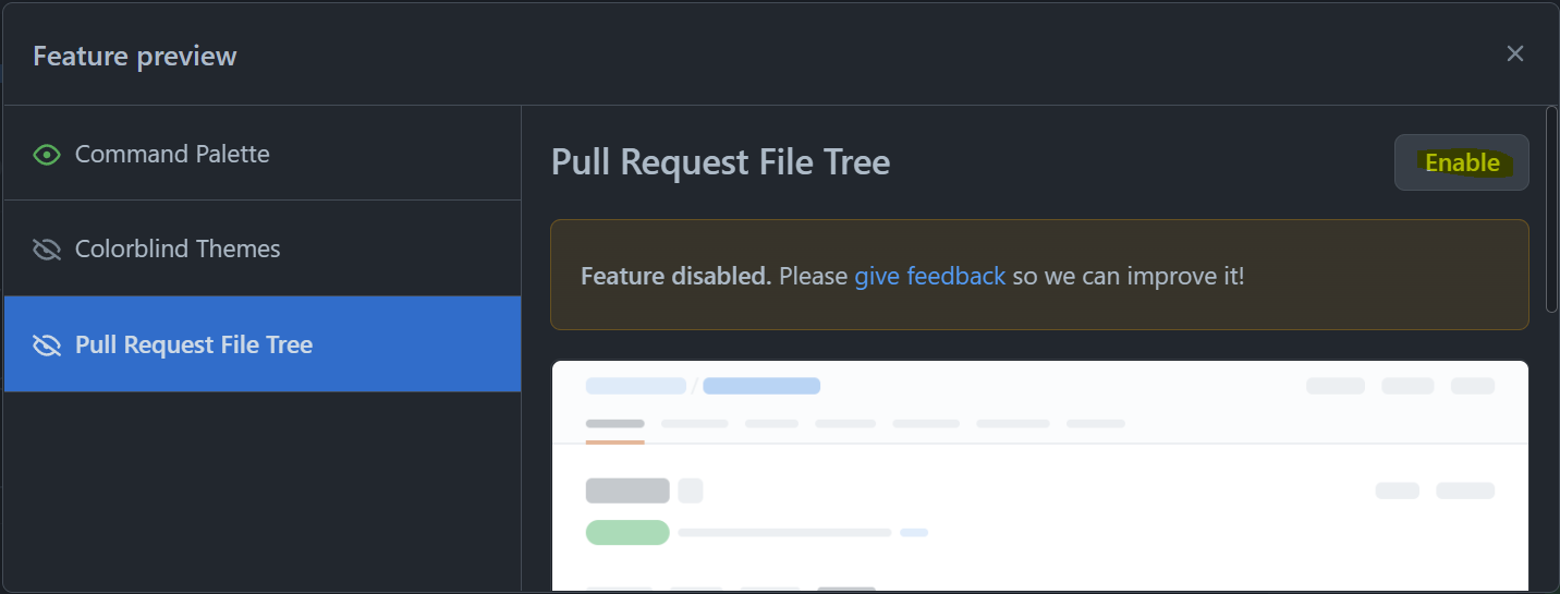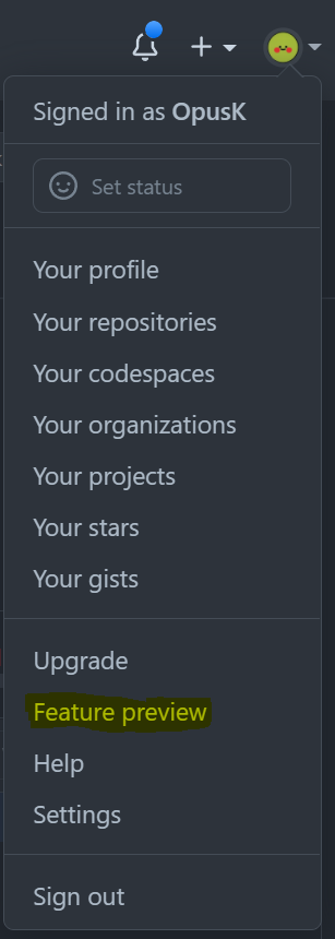 우측 상단의 아바타를 누르면 드롭다운되는 메뉴에서 [Feature preview]를 누르면 된다.